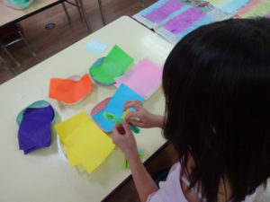 8月の七夕まつりに向けての製作では、吹き流しを作りましたよ。好きな色を選び、花飾り作りと和紙染めを楽しんで取り組んでいました。完成した吹き流しを見て、「涼しく感じる」「綺麗に出来た」と喜んでいた子どもたちです。