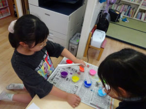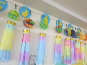 8月の七夕まつりに向けての製作では、吹き流しを作りましたよ。好きな色を選び、花飾り作りと和紙染めを楽しんで取り組んでいました。完成した吹き流しを見て、「涼しく感じる」「綺麗に出来た」と喜んでいた子どもたちです。